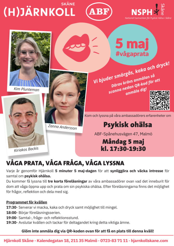 Du kommer få lyssna till tre korta föreläsningar av våra ambassadörer; Kim Plunteman, Zanna Andersson och Kiriakos Backis, vad det inneburit för dom att våga öppna upp och prata om sin psykiska ohälsa. Efter föreläsningarna finns det möjlighet för frågor, reflektion och dela med sig själv.