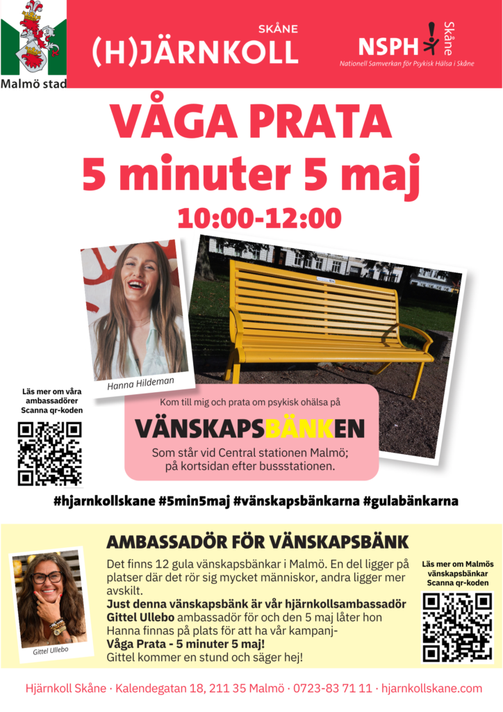 Vår hjärnkollambassadör Hanna Hildeman finns tillsammans med hjärnkollambassadören Gittel Ullebo som även är ambassadör för den gula bänken för att prata en stund. Vi genomför evenemanget i samarbete med Malmö stad som ansvarar för bänkarna.