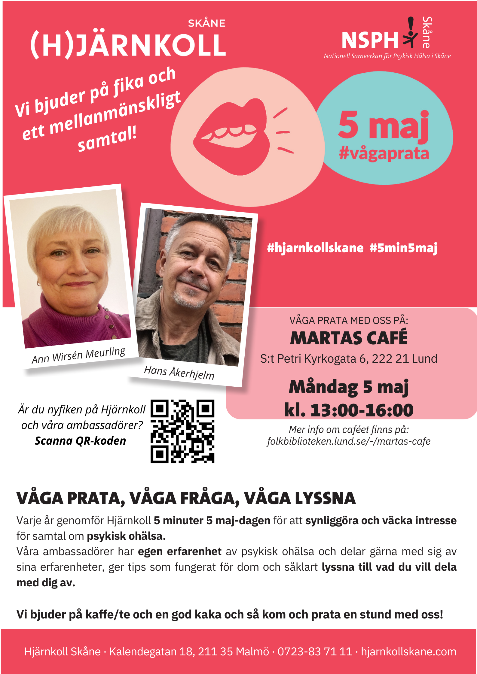 Våra ambassadörer Hans Åkerhjelm och Ann Wirsén Meurling har egen erfarenhet av psykisk ohälsa och delar gärna med sig av sina erfarenheter, ger tips som fungerat för dom och såklart lyssna till vad du vill dela med dig av.